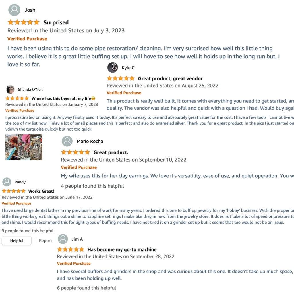 Great Tool, Easy to use, Performs as listed, Great Buy Considering the extra buffing pads included, I use it to polish Restored Tobacco Pipes and Tarnished Silver. The variable speed is great and the motor is strong enough to bare into the wheels without stopping. I've raised it up to get more height off the bench so I can polish lower on the wheels. I Absolutely love it and would highly recommend it.